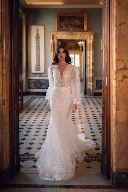 Laila - Luxurious tulle and organza, creating a chic and sophisticated look. The intricate lace, sequins, puffed sleeves, glitter and flowers details add a touch of sparkle to the elegant silhouette.